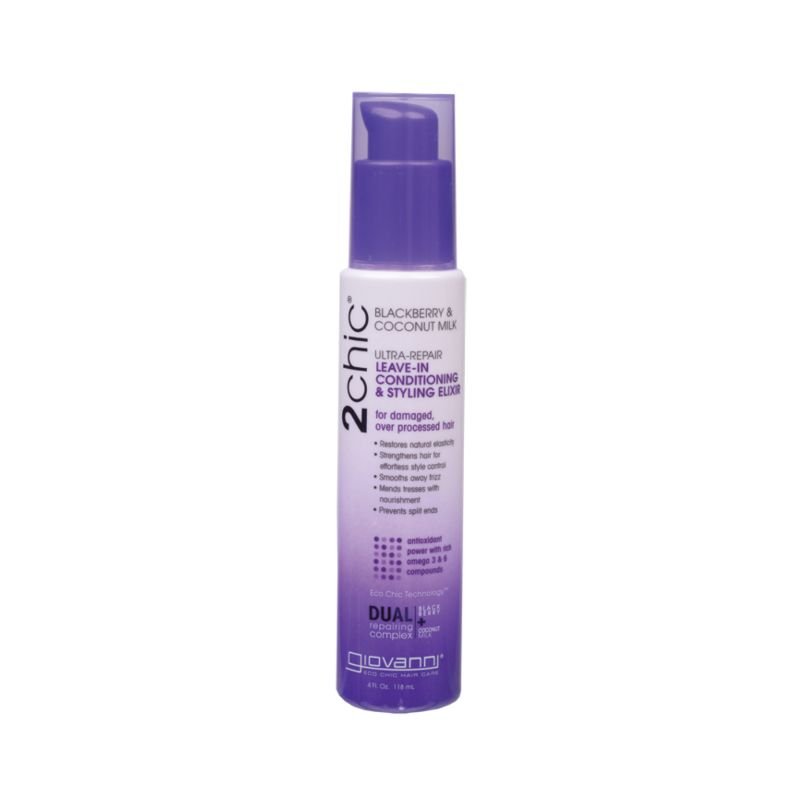 Giovanni 2chic® Leave-In Conditioning & Styling Elixir repairs and rejuvenates with a Dual Repairing Complex of Blackberries and Coconut Milk. This nourishing treatment hydrates, protects, and smooths textured hair, leaving it flawless and frizz-free. Paraben-free, color-safe, and cruelty-free, it restores hair without dulling or stripping color.
