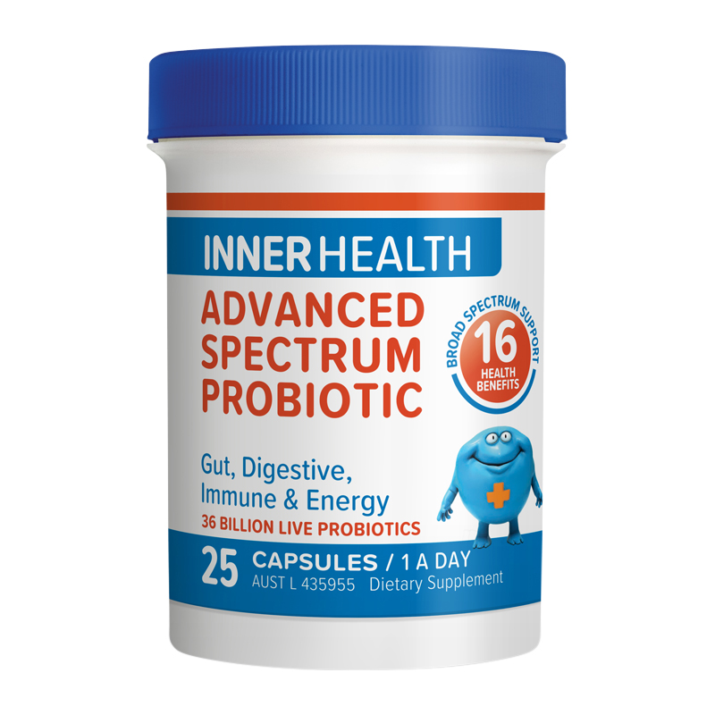 Inner Health Advanced Spectrum Probiotic is a high strength, broad spectrum probiotic that provides 16 health benefits including energy production, digestive and immune system support, skin health and the maintenance of vitamin D, B1 and B2 levels.