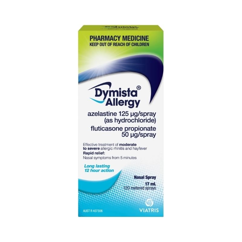 Dymista® Allergy is for the treatment of moderate to severe allergic rhinitis (hayfever). Symptoms of hayfever include sneezing, runny, itchy, and/or blocked nose. Dymista Allergy contains 2 active ingredients: azelastine hydrochloride and fluticasone propionate. Azelastine hydrochloride belongs to a group of medicines called antihistamines. Antihistamines work by preventing the effects of substances such as histamine that the body produces as part of an allergic reaction.Fluticasone propionate belongs to a group of medicines called corticosteroids which are used to help reduce inflammation.