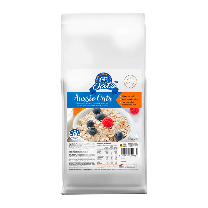 Pure steamed rolled oats. Gloriously free go to great lengths to ensure there is nil gluten contamination in this product from the gluten found in wheat, rye, and barley. In Australia, we are unable to call any product that contains oats in Australia – gluten-free. A small percentage of Coeliac patients react to the Avenin in oats, please do an oat challenge before consuming.