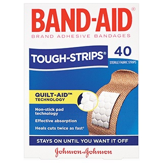 Inside every Waterproof Tough-strips bandage you’ll find these technologies: Quilt-Aid technology: Non-stick pad technology. A unique quilted pad which draws fluid away from the wound. Waterproof: 100% waterproof. Shields out water, dirt and germs. Super Stick: Stays on until you want it off. Band-Aid Brand Adhesive Bandages help cuts heal twice as fast as uncovered cuts.
