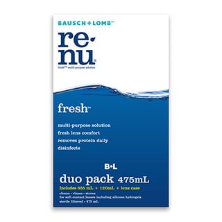 Renu Multi-Purpose Solution cleans, rinses, disinfects and removes protein daily. It is proven safe and effective for soft contact lenses. Duo Pack Includes: 1 x Sterile 355mL Renu Multi-Purpose Solution 1 x Sterile 120mL Renu Multi-Purpose Solution 1 x Lens Case