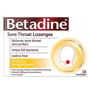 Betadine Sore Throat Lozenges relieve sore throat discomfort, help kill bacteria and are iodine free. In a soothing honey and lemon flavour and a handy pack of 16 lozenges.