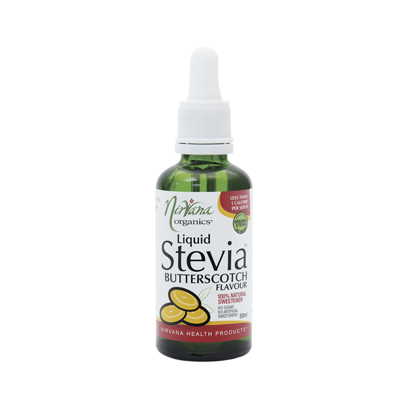 Nirvana Organics Butterscotch Flavoured Stevia Liquid is a 100% natural, sugar free sweetner. The Australian made formula is derived from certified organic stevia extract and is low in calories, allowing for guilt-free food and drink sweetening. Butterscotch flavour has a rich caramel-like taste.