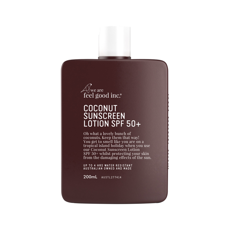 We Are Feel Good Inc. Coconut Sunscreen Lotion SPF 50+ will have you smelling like a tropical island holiday! It is broad spectrum, non-greasy and up to 4 hours water resistant to give you maximum coverage. Aloe vera and vitamin E are included for their skin-nourishing properties and aid in soothing dry, sun damaged skin. This formula does not include parabens, preservatives, oxybenzone or octinoxate, making it suitable for most skin types. Founded right here in Australia, We Are Feel Good Inc. has created a range of sunscreen products that are specifically tailored to an Aussie summer filled with sun and surf!
