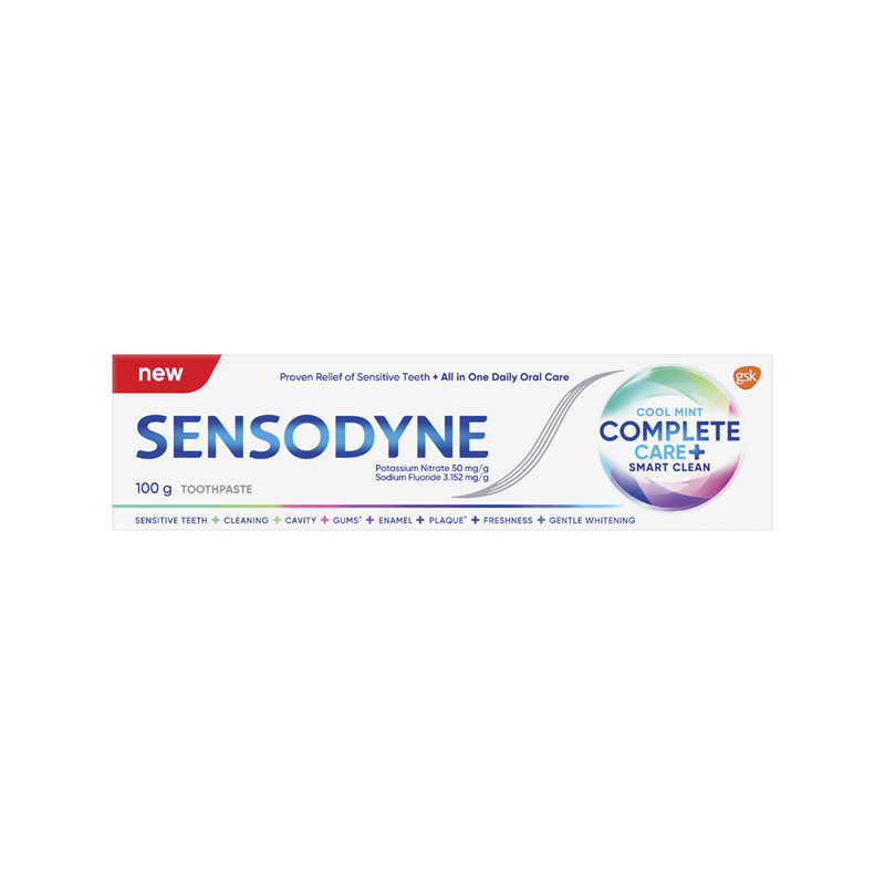 Sensodyne Cool Mint Complete Care + Smart Clean provides 7 important oral health benefits plus sensitivity protection. Don’t compromise on your oral health needs. Sensodyne Cool Mint Complete Care + Smart Clean is a fluoride toothpaste with All-in-One protection, delivering daily care for sensitive teeth. Cool Mint for an invigorating lasting cooling sensation.