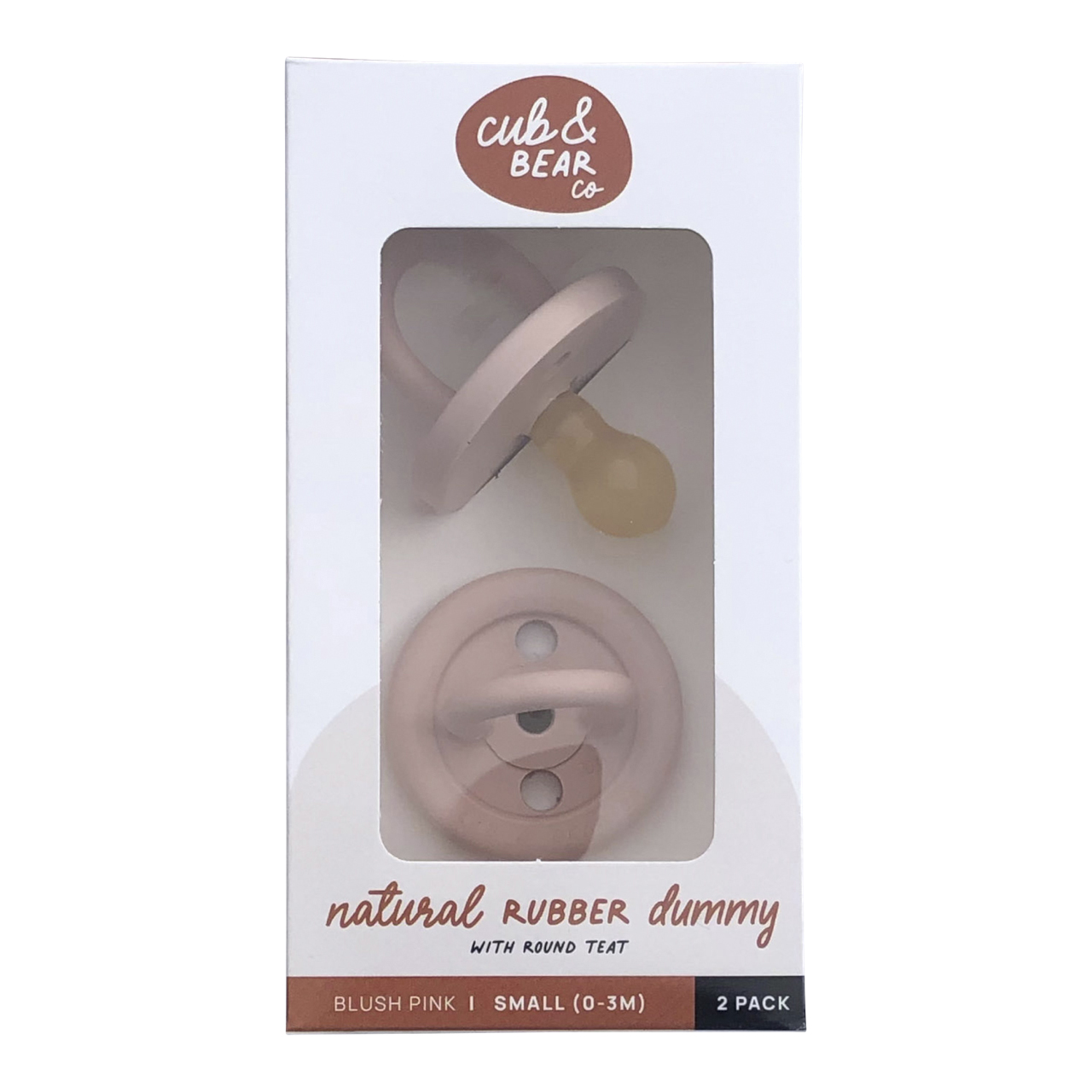 Cub & Bear Co Blush Pink Natural Rubber Dummy Small 0-3 months is made from a single piece of pure natural rubber (so it is plastic free and safe from separating parts). It contains no BPA, parabens or other nasties. This dummy utilises a large cherry teat, making it easier to hold in, and a big shield that touches their nose to emulate the feeling and comfort of breastfeeding. The use of soft rubber also triggers this association. This beautiful blush pink dummy is suitable for babies 0-3 months.