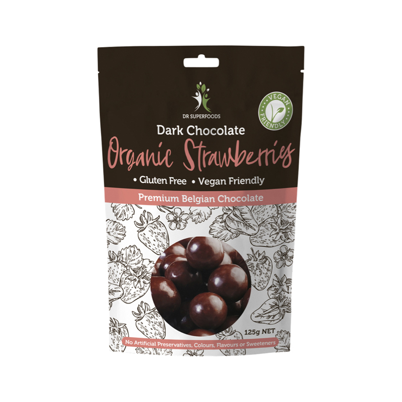 Dr Superfoods Dark Chocolate Organic Strawberries are Australian made from 100% natural ingredients. The health conscious snack comprises of organic strawberries coated in dark, vegan chocolate. Free from gluten, the cherries have a sweet and loveable flavour.