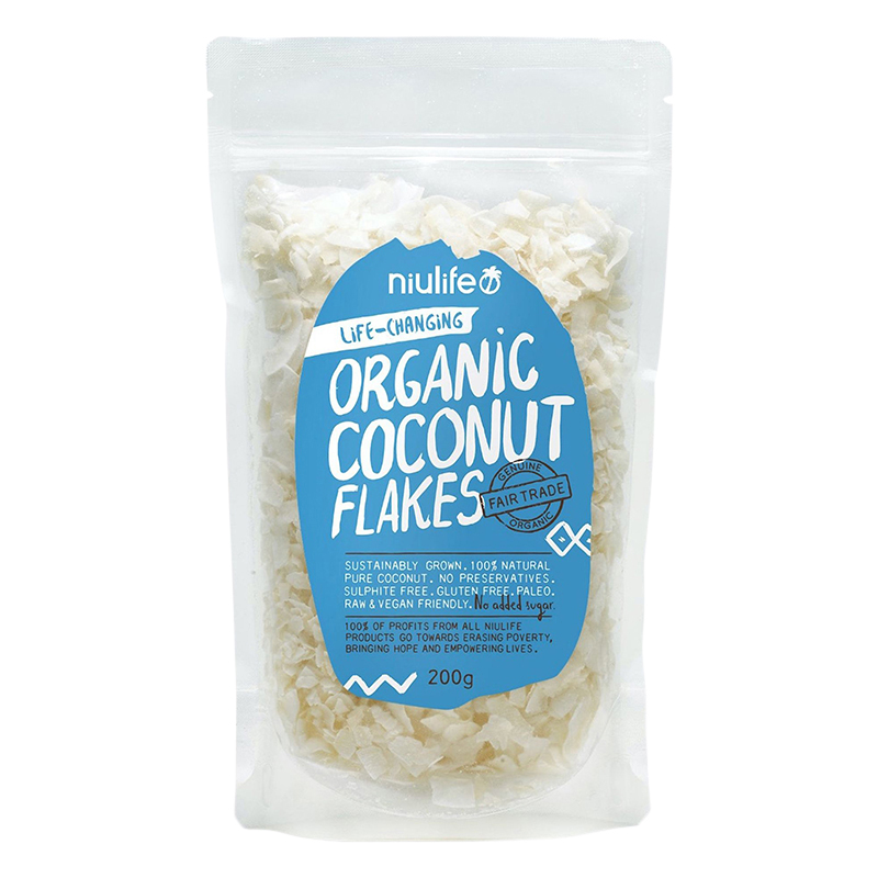 Niulife Flaked Coconut is certified organic and sulphite free. Coconut is a rich source of Lauric Acid (anti-fungal, anti-microbial) and is full of dietary fibre.