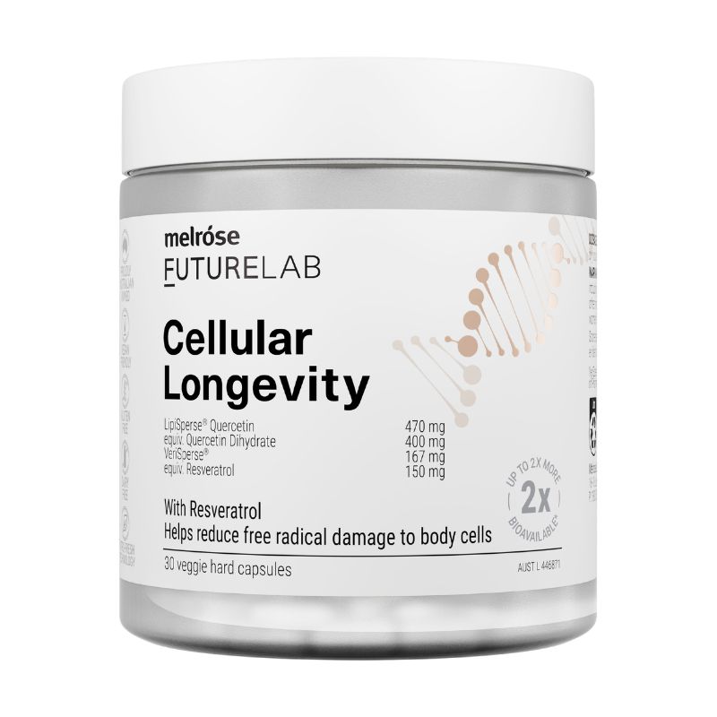 Melrose FutureLab Cellular Longevity features a premium blend of Resveratrol and Quercetin, two antioxidant nutrients known to help combat oxidative stress and support health at a cellular level. As oxidative stress increases with age, these antioxidants help protect the body by reducing free radicals formed in the body.