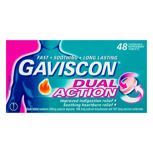 Gaviscon Dual Action brings fast, soothing and long lasting relief from the pain and discomfort of heartburn (gastric reflux) and indigestion. It works in two different ways: 1) More effective reduction of excess stomach acid to relieve discomfort. 2) Forms a protective layer over the stomach contents to soothe the burning pain in your chest.