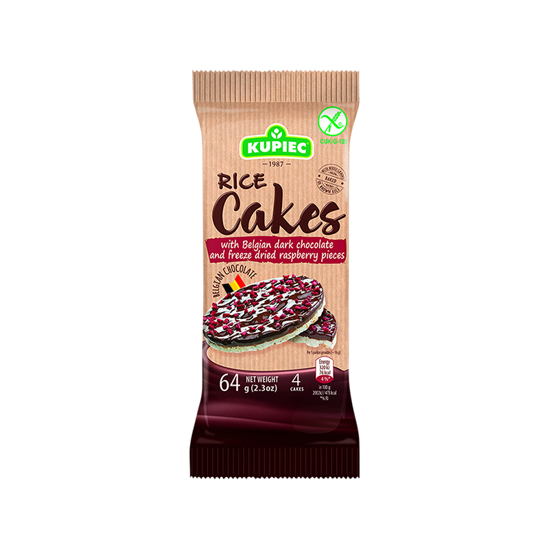 Gluten free rice cakes coated with pure Belgian dark chocolate and sprinkled with freeze-dried raspberry pieces are a guilt-free snacking experience with a touch of indulgence.