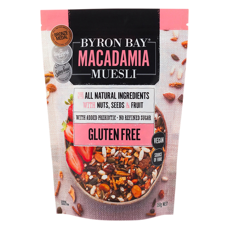 Sunflower kernels, Rice Bran Straws (Rice Flour, Rice Bran, Prune juice Concentrate), Organic Pepitas, Almonds, Organic Sultanas, Rice Puffs (Rice Flour & Rice Bran), Sesame Seeds, Organic Raisins, Organic dried Apricots (Organic Apricots, Rice Flour), Macadamia Nuts (4%), Organic Coconut Blossom Nectar, Organic Dried Apple, Organic Dried Pear (Organic Pear, Rice flour), Organic Puffed Millet, Organic Puffed Amaranth, Organic Puffed Brown Rice, Macadamia Oil, Inulin (Prebiotic) – Chicory root (0.1%) 160mg/ 100g.