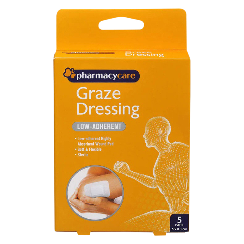 Grazes are usually harmless abrasion of the upper skin layers that occurs after falling on knees, hands or elbows, or scratching over a rough surface with some skin coming off subsequently. Abrasions can be painful since the injury often extends to the many fine nerve endings subjacent to the skin. Pharmacy Care Low Adherent Dressing absorbs excess fluid, cushions & protects.