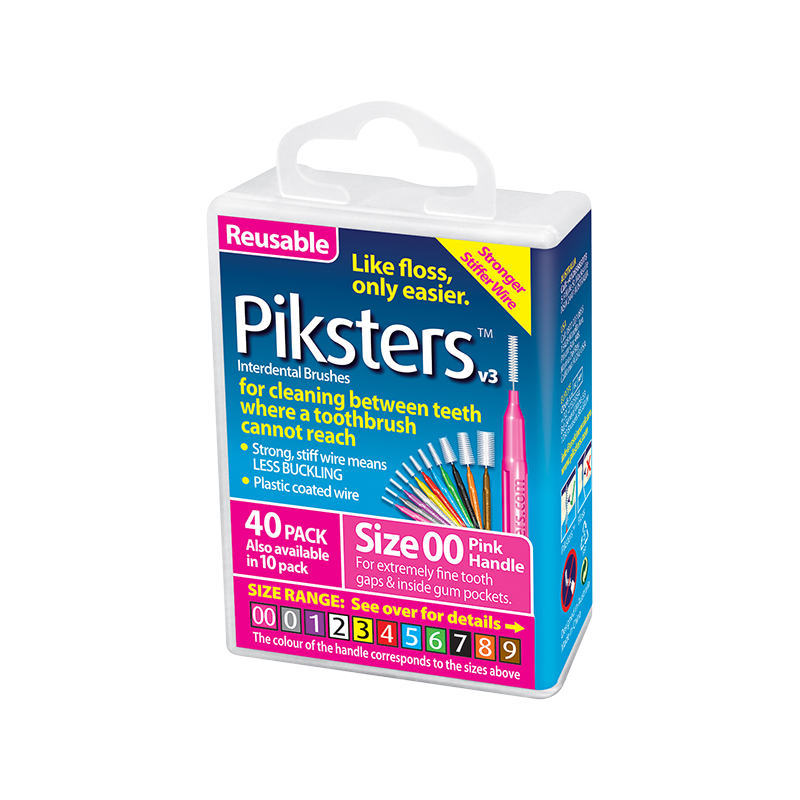 Piksters bristles reach into and clean the indents on the surfaces between your teeth – especially at the gum line of molars and premolars. Floss is not as effective in this situation, although it is very effective in other areas and should be used in conjunction. Piksters remove plaque and food particles in areas normal toothbrushes do not reach as effectively. Plaque is a significant factor in decay and gum disease. Decaying food particles can also cause bad breath.