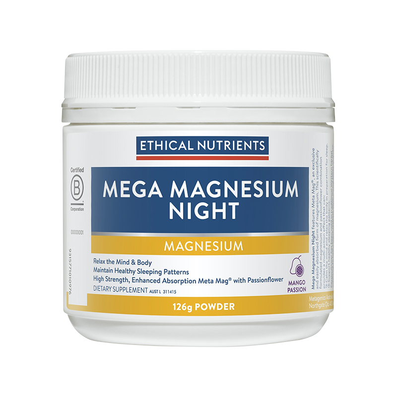 It can be difficult to relax at the end of a long day when your mind is racing, and your body is tense. Ethical Nutrients Mega Magnesium Night has been meticulously crafted to calm the mind and relax your muscles to prepare you for a good night’s sleep. Formulated with high strength, easily absorbed magnesium and passionflower, it supports healthy sleeping patterns so you can wake up refreshed and ready to tackle your day head-on. Available in a delicious mango passion powder that you can drink hot or cold before bed. Make Mega Magnesium Night part of your nightly wind-down routine.