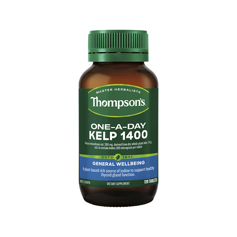 Thompson’s One-A-Day Kelp is formulated for convenience with a One-A-Day dose. Kelp is a plant-based rich source of Iodine, an important trace mineral to support:
