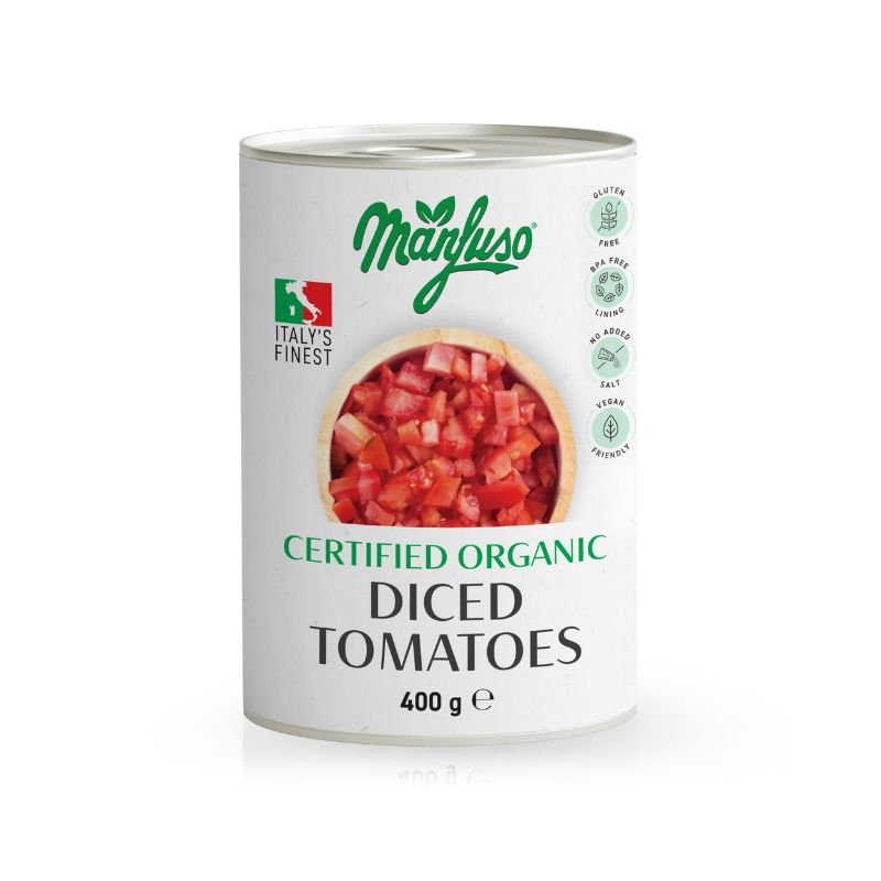 The Manfuso organic chopped tomatoes are tasty and ready-to-use, obtained by chopping the best fresh round tomatoes cultivated in the South of Italy. They are then peeled, chopped in cubes and tinned with a natural and dense tomato juice, without adding any salt or preservatives.