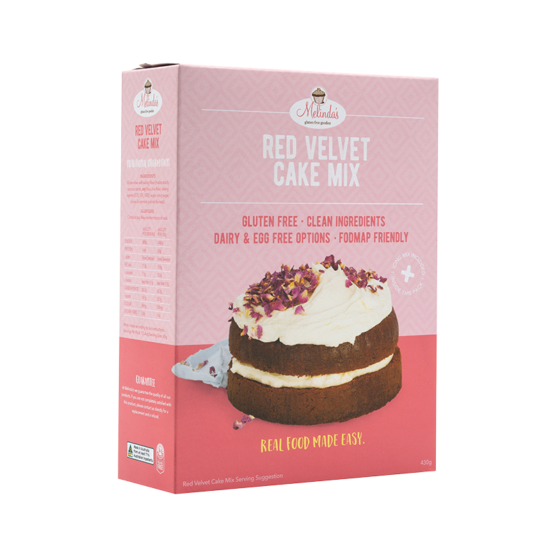 Melinda’s Gluten Free Goodies Red Velvet Cake is a dramatic looking buttermilk cake with a hint of cocoa creating a mild chocolate flavour. The cake is a stunning deep red colour and contrasts with the cream cheese icing to make the perfect entertaining cake for any event or create a slab cake portioned into 50g pieces. Plus, it’s gluten free!