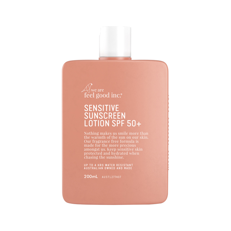 We Are Feel Good Inc. Sensitive Sunscreen Lotion SPF 50+ is broad spectrum, non-greasy and up to 4 hours water resistant to give you maximum coverage. Designed for sensitive skin, it has no added fragrance and an ultra-lightweight formula. Aloe vera and vitamin E are included for their skin-nourishing properties and aid in soothing dry, sun damaged skin. This formula does not include parabens, preservatives, oxybenzone or octinoxate, making it suitable for most skin types. Founded right here in Australia, We Are Feel Good Inc. has created a range of sunscreen products that are specifically tailored to an Aussie summer filled with sun and surf!