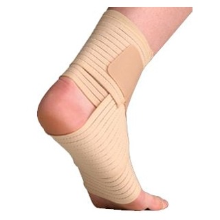 Place foot in elastic sock, take wrap and cross over the top of foot and under the arch. Then wrap around the ankle attaching the hook closer for desired compression. Please turn inside out to use on either ankle.