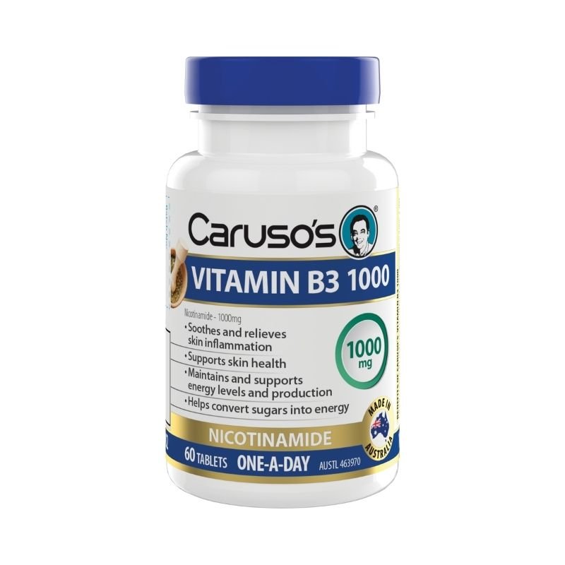 Caruso’s Vitamin B3 1000 contains 1000mg of Nicotinamide in a one-a-day tablet designed to supplement your daily Vitamin B3 intake. Caruso’s Vitamin B3 1000 supports skin health and can soothe and relieve skin inflammation. Additionally, Vitamin B3 can maintain and support energy levels and energy production and help convert sugars into energy.