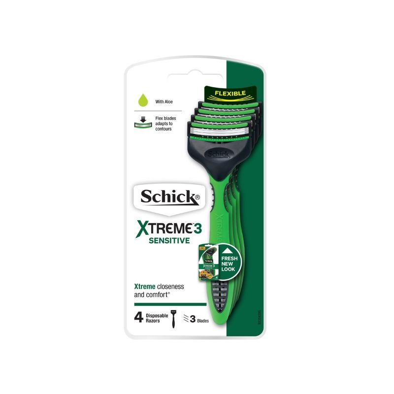Schick Xtreme 3 Disposable Razors Sensitive Men with aloe vera are flexible and adapt to the contours of your face for an extremely close and comfortable shave. Schick Xtreme3 Sensitive has 3 blades that flex and pivot to adapt to the contours of your face, so you get a close smooth shave. This disposable razor includes a comfort strip and guard bar with lubricant for a smooth shave. Also with an ergonomic handle with a soft rubber grip for improved control. For convenience, the handle’s easy-rinse design helps keep blades from clogging.